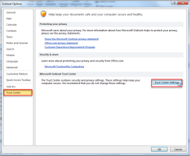 In Outlook Options, Click Trust Center –> Trust Center Settings